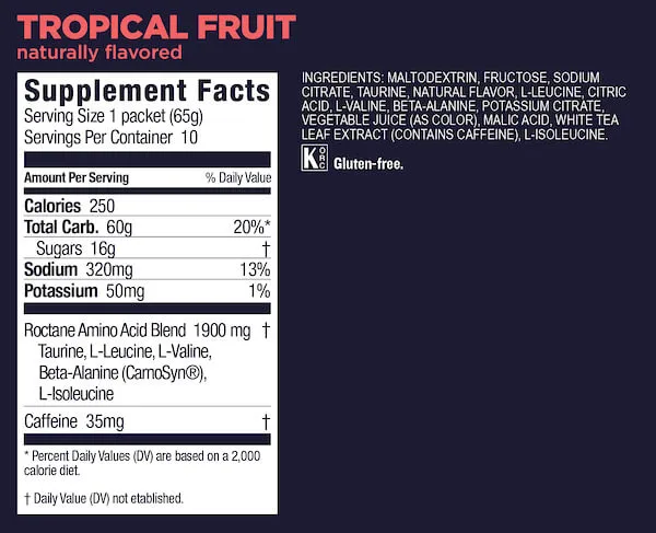 Созданный специально для использования при нагрузках высокой интенсивности, энергетический напиток GU Roctane Drink Mix содержит еще больше электролитов и углеводов, чем классический напиток GU Hydration Drink Mix. Порция напитка содержит 250 калорий, а комбинация углеводов (мальтодекстрин и фруктоза) помогает обеспечить максимально эффективное их усвоение, одновременно не допуская проблем с желудком.